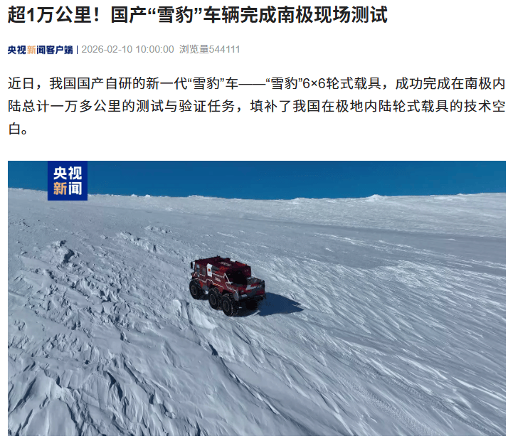 近日,我國極地科研領域傳來重大喜訊:自主設計研制的新一代“雪豹”6×6輪式載具,在南極內陸成功完成總里程超一萬公里的測試驗證任務,一舉填補國內極地內陸輪式載具技術空白,標志著我國極地考察裝備邁入全新發展階段。