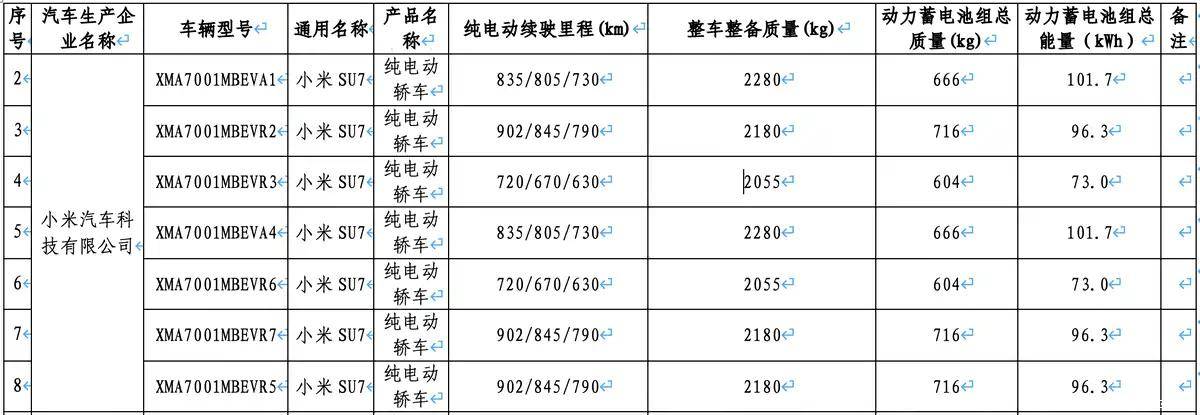 工信部最新發布的《減免車輛購置稅的新能源汽車車型目錄(第二十七批)》中,新一代小米SU7的詳細參數首次曝光。這款新車將提供73kWh、96.3kWh、101.7kWh三種電池容量選擇,對應CLTC工況下九種續航版本,續航里程覆蓋630km至902km區間。其中標準版續航從700km提升至720km,Pro版從830km躍升至902km,Max版則由800km增至835km。