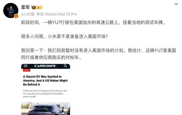 針對這一疑問,小米創辦人、董事長兼CEO雷軍在社交平臺上做出了回應。他明確表示,小米汽車目前暫時沒有進入美國市場的計劃。雷軍解釋稱,前段時間出現在美國加州高速公路上的那輛YU7,很可能是美國同行或供應商購買的對標車。