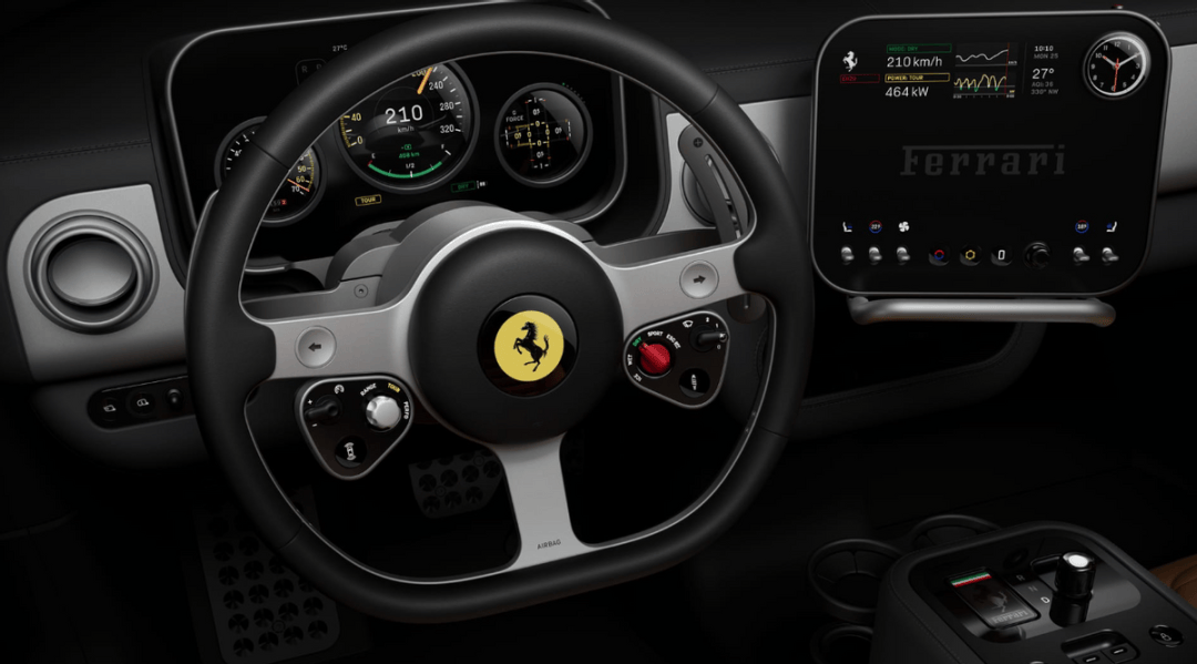 內飾設計由蘋果前首席設計官Jony Ive創立的LoveFrom團隊主導,在保留法拉利機械操控基因的同時,融入極簡主義美學。設計師摒棄全觸控化趨勢,采用大量實體按鍵、旋鈕與撥桿,方向盤控制模塊布局借鑒F1賽車設計,兼顧功能性與儀式感。三輻式方向盤以19個CNC加工零件構成,使用100%再生鋁材,較傳統方向盤減重400克,其造型靈感源自20世紀50年代經典納爾迪木質方向盤。