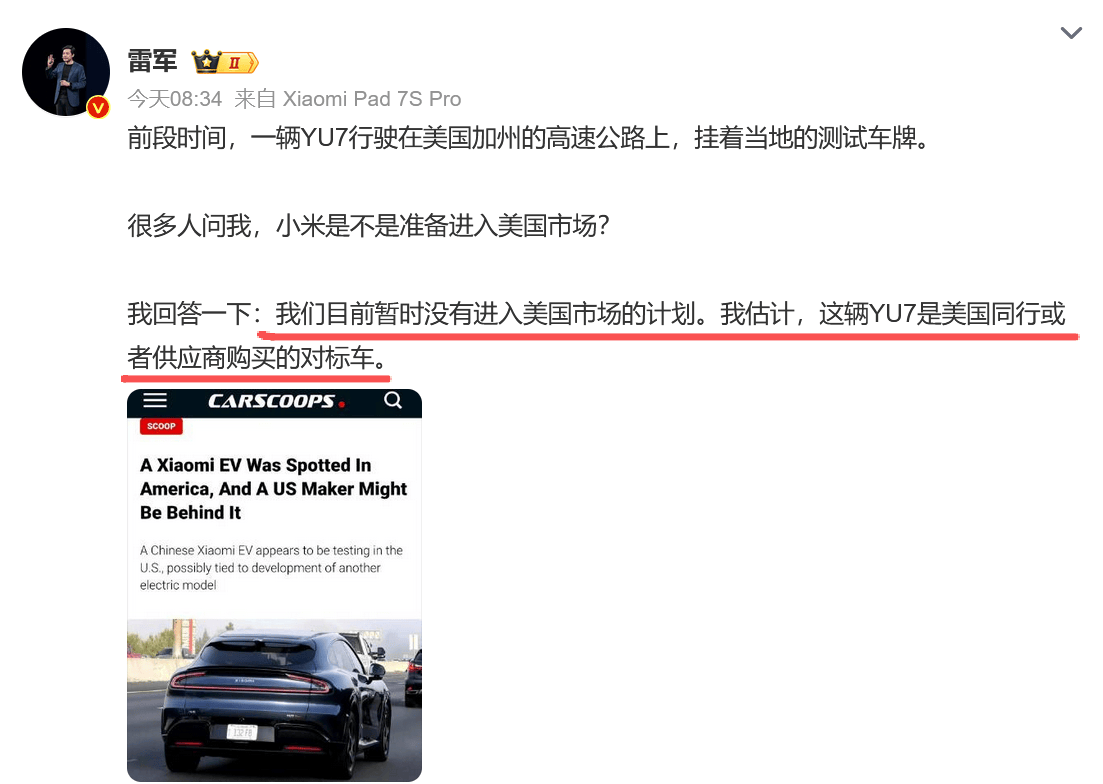 此前,一輛小米YU7出現在美國加州高速公路上,掛著當地測試車牌,這引發了網友對小米汽車進軍美國市場的猜測。然而,雷軍很快辟謠,稱目前小米汽車暫無進入美國市場的計劃,YU7掛當地車牌可能是美國同行或供應商購買的對標車。不過,雷軍也強調了“暫時沒有”,這為未來留下了想象空間。