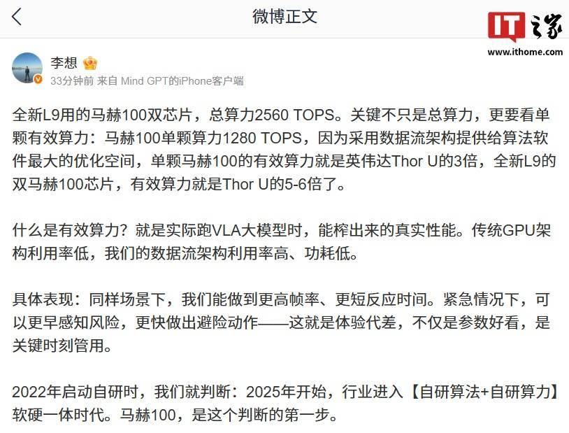 理想汽車CEO李想近日在社交平臺(tái)發(fā)文,詳細(xì)介紹了全新理想L9搭載的馬赫100雙芯片技術(shù)。這款芯片單顆算力達(dá)1280 TOPS,總算力高達(dá)2560 TOPS,但其核心優(yōu)勢(shì)在于數(shù)據(jù)流架構(gòu)帶來的高效利用率。據(jù)李想透露,單顆馬赫100的有效算力是英偉達(dá)Thor U的3倍,而雙芯片組合后的有效算力更是達(dá)到Thor U的5至6倍。
