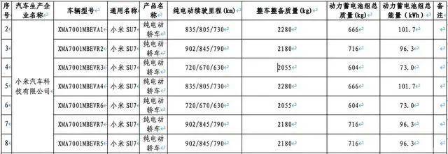 工信部最新發布的《減免車輛購置稅的新能源汽車車型目錄(第二十七批)》中,新一代小米SU7的詳細配置首次曝光。這款備受關注的新能源轎車將推出73kWh、96.3kWh、101.7kWh三種電池容量版本,對應CLTC工況下630km至902km的續航表現,形成覆蓋主流市場的完整產品矩陣。
