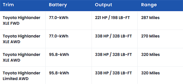 動力系統方面,純電漢蘭達提供XLE和Limited兩種配置選擇。XLE入門版搭載前置單電機,最大功率221馬力,匹配77千瓦時電池組,續航里程約461.9公里;高配版則升級為雙電機四驅系統,動力提升至338馬力,用戶可根據需求選擇77千瓦時或95.8千瓦時電池組,對應續航里程分別為434.5公里和514.9公里。Limited頂配版沿用雙電機四驅與95.8千瓦時電池組合,續航表現與XLE高配版一致。充電方面,新車標配NACS接口,可兼容特斯拉充電樁,從10%充至80%僅需約30分鐘,同時支持電池預加熱與V2L對外放電功能,進一步拓展了使用場景。