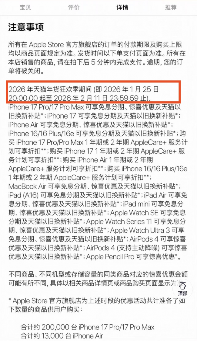 目前天貓年貨節針對iPhone 17系列的優惠并不多,只有iPhone 17系列領券立減300元、iPhone Air疊加驚喜券、國補至高立減2500元,標準版iPhone 17并沒有任何優惠。關鍵是這些優惠只截至2月11日24點,超過截止日期后就不能使用優惠了,而且春節期間還不發貨。