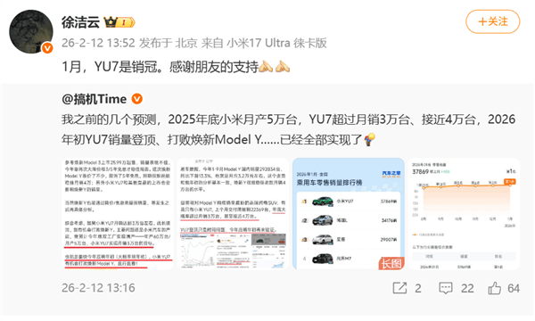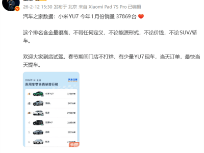回顧2025年第四季度表現,YU7在10月、11月分別取得33662輛和33729輛的銷量,顯示出穩定的產能釋放能力。12月銷量突破3.9萬輛的峰值,既驗證了市場需求的旺盛,也為新年首月登頂奠定基礎。這種持續攀升的軌跡,與部分新勢力品牌常見的"高開低走"模式形成鮮明對比。