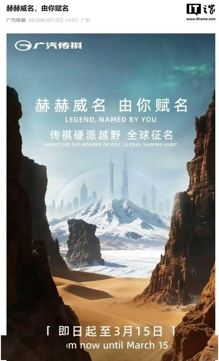 目前官方尚未公布車輛的核心參數、動力配置及具體命名方案,僅通過視覺符號傳遞產品理念。征名活動的啟動既是對用戶共創模式的探索,也為后續市場傳播埋下伏筆。業內人士分析,隨著硬派越野市場熱度攀升,廣汽傳祺此舉或將加速品牌年輕化轉型,具體產品競爭力需待更多信息披露后評估。