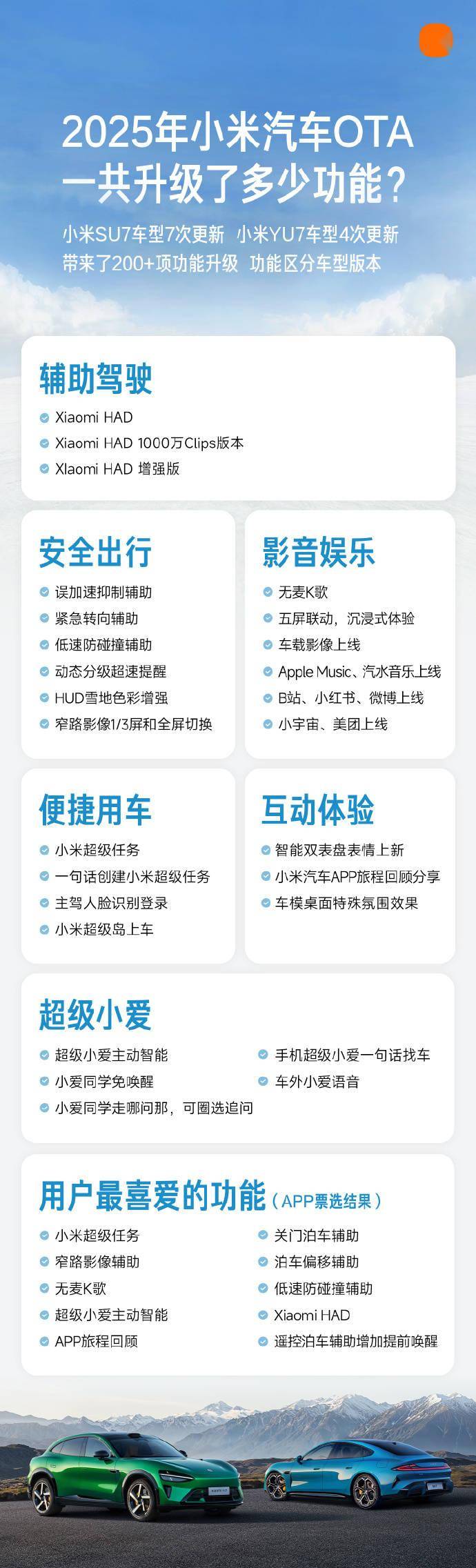 小米汽車近日對外披露了其車型功能更新的詳細(xì)數(shù)據(jù)。2025年,小米SU7車型累計完成7次系統(tǒng)更新,小米YU7車型則進(jìn)行了4次迭代,兩大車型合計新增超過200項功能,覆蓋輔助駕駛、安全出行、智能交互等多個領(lǐng)域。