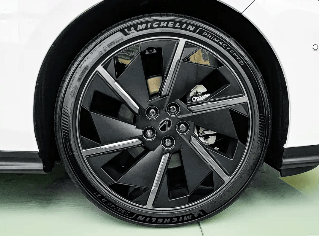 車身側面,新車延續了標準的三廂轎車輪廓,不過車頂線條勾勒出溜背的弧線,增添了幾分動感。腰線設計獨特,從下往上延伸,與車門上的黑色飾條交匯,在視覺上拉長了車身,使其看起來更加修長。充電口設置在前翼子板上,門把手采用半隱藏式設計,兼顧了降低風阻和實用性。輪轂尺寸直接升級到21英寸,搭配235/45 R21的輪胎,盡顯力量感。