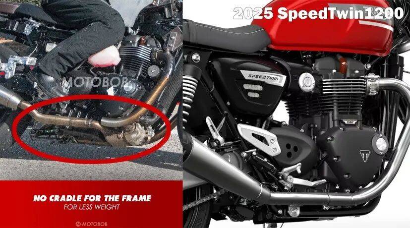 海外媒體近日捕捉到凱旋SpeedTwin1200全新測試車的身影,從路試畫面來看,這絕非簡單的外觀微調,而是基于全新底盤打造的新一代車型。由于車身尚未覆蓋完整外觀件,推測其仍處于前期開發(fā)階段。車架部分的變化尤為顯著,標志性的雙搖籃鋼管車架被棄用,轉而采用以發(fā)動機作為受力結構的現代設計。這種調整不僅有望大幅減輕車重——現款整備質量為216kg,還能使彎道中的車身反饋更加直接,顯著提升操控性能,整體設計思路完全偏向運動化。