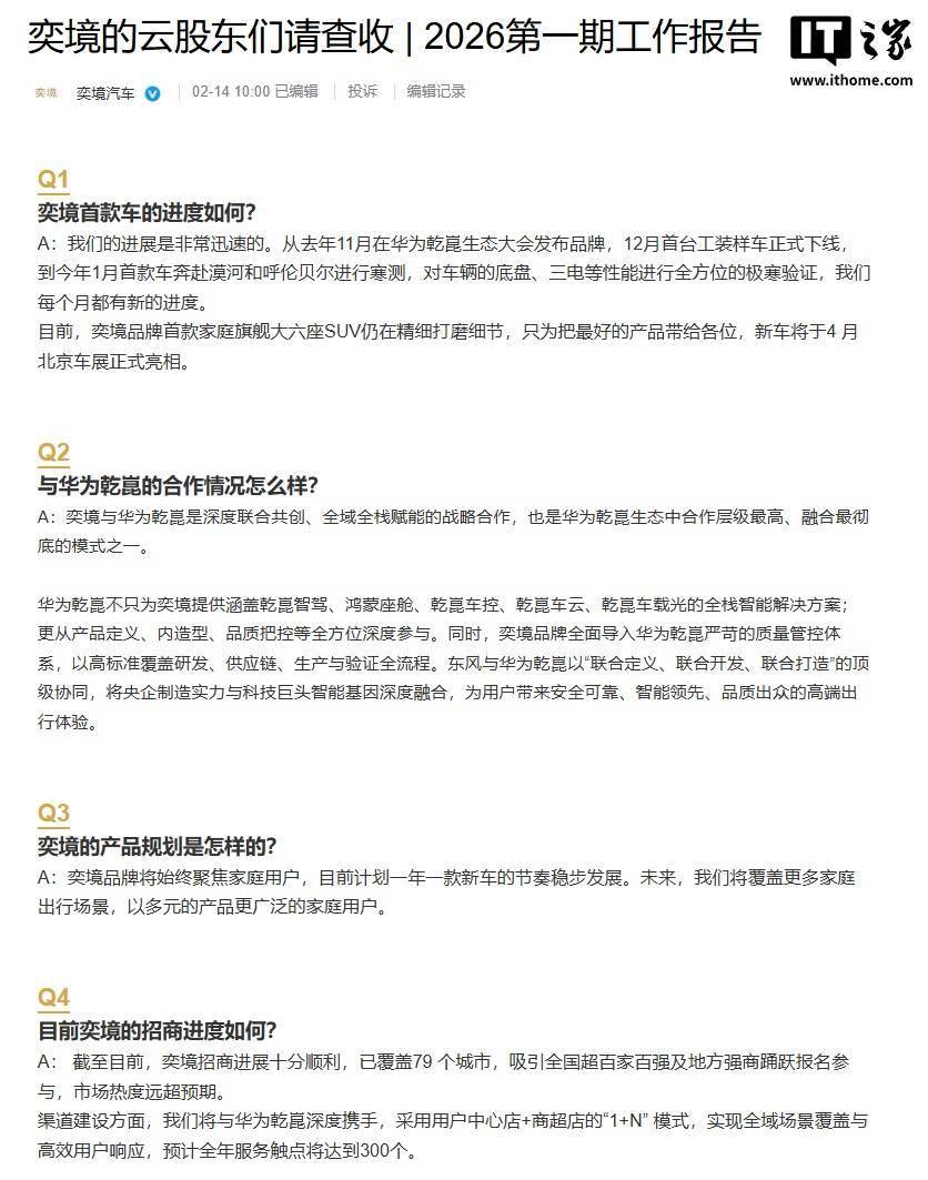近日,奕境汽車通過官方渠道向其“云股東”發(fā)布了2026年首期工作進(jìn)展報(bào)告,詳細(xì)披露了品牌首款車型的研發(fā)動態(tài)、與華為乾崑的戰(zhàn)略合作細(xì)節(jié)、產(chǎn)品布局規(guī)劃以及渠道建設(shè)成果。