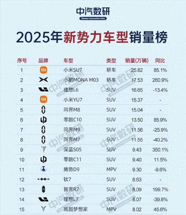 面對如此洶涌的輿論浪潮,換作其他新勢力車企,或許早已難以承受,銷量下滑幾乎是必然結果。然而,小米汽車卻展現出了驚人的韌性——輿論越激烈,市場表現反而越亮眼。從2025年的銷量數據來看,小米汽車不僅未受影響,反而一路高歌猛進。全年銷量持續攀升,年底時月銷量突破5萬輛,成功躋身新勢力車企前列。其中,小米SU7憑借出色的表現成為新勢力銷冠,而上市僅半年的YU7也迅速崛起,排名第四,這樣的成績在競爭激烈的市場中堪稱亮眼。