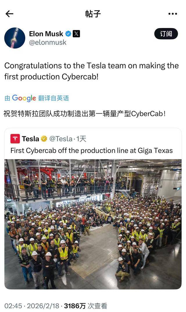 特斯拉公司創始人兼首席執行官埃隆·馬斯克在社交平臺X上宣布,首輛量產型Cybercab已在美國得克薩斯州超級工廠正式下線。這一消息標志著特斯拉在自動駕駛網約車領域邁出了關鍵一步,馬斯克特別向項目團隊表達了祝賀,稱這是公司技術突破與生產能力結合的重要成果。