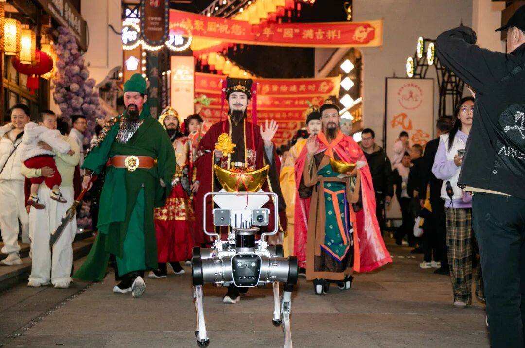這場視覺盛宴的科技元素早在當日下午便已預熱。由京格匯龍研發的輪式機器人與仿生機器狗在街巷間穿梭互動,不僅能主動揮手致意,還能與游客玩“石頭剪刀布”游戲。這些充滿未來感的設備成為最受歡迎的“明星”,游客丁女士感嘆:“以前只在視頻里見過,今天親眼看到太震撼了。”
