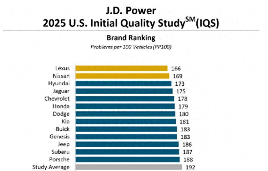 近日,國際權威調研機構J.D.Power公布了2025年度美國市場新車質量研究報告,該報告以新車交付90天內每百輛車的故障數(PP100)為評估標準,數值越低代表質量越可靠。數據顯示,今年行業平均故障數為192起,僅有13個品牌達到或優于這一基準,其中本土品牌與韓系品牌表現亮眼,而傳統德系豪華品牌集體失守。