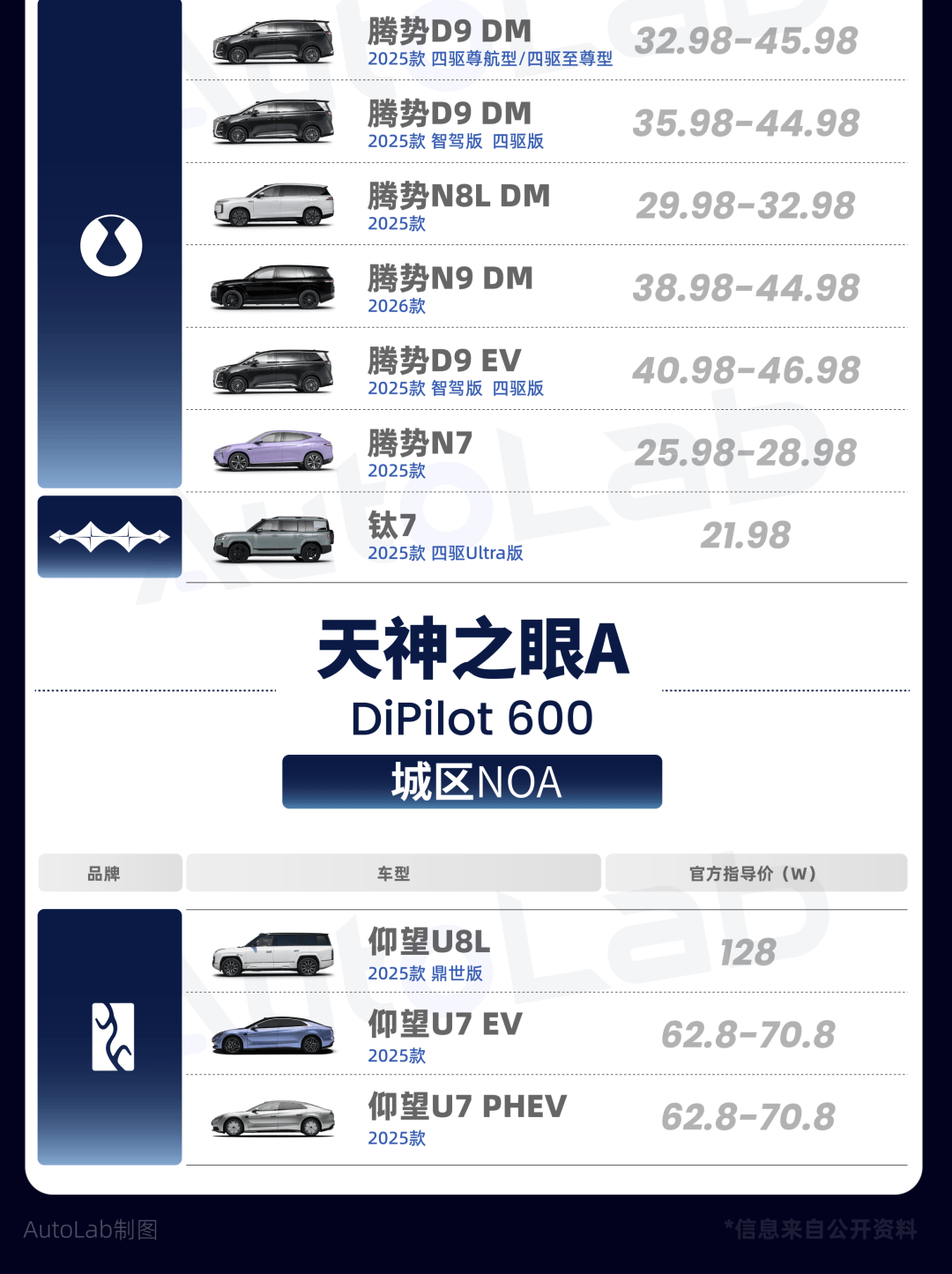 天神之眼B則主要面向20萬元以上的車型,包括比亞迪部分高端車型、方程豹以及騰勢品牌。硬件配置上,B方案通常采用單激光雷達,算力為254TOPS,但2025款騰勢N7例外地搭載了雙激光雷達。盡管B方案在功能上與A方案相近,但由于激光雷達數量和算力的差異,其安全冗余設計相對較少。