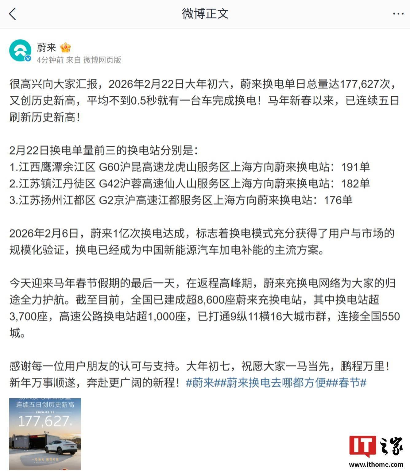 春節(jié)假期期間,蔚來換電服務(wù)迎來新一輪使用高峰。2026年2月22日(大年初六),蔚來單日換電總量突破177,627次,刷新歷史紀(jì)錄,平均每0.5秒即完成一次換電服務(wù)。這一數(shù)據(jù)較前一日的175,976次繼續(xù)攀升,標(biāo)志著蔚來換電網(wǎng)絡(luò)在節(jié)假日期間的高效運(yùn)轉(zhuǎn)能力。