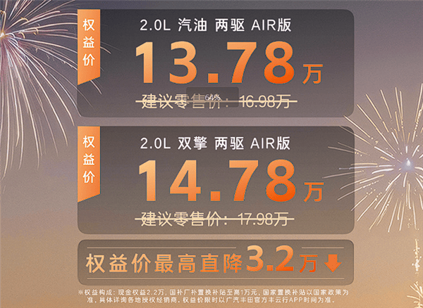 廣汽豐田全新威蘭達AIR版今日正式登陸市場,作為新一代車型的入門版本,其官方指導價區間為13.78-14.78萬元,較此前16.98萬元的起售價直降3.2萬元。這一價格調整得益于現金優惠、國家補貼及廠家補貼的疊加效應,創下該車系價格新低。新車同步推出限時購車權益,包括2099元享4次原廠保養的直銷套餐,以及首付1.46萬元、月供1650元的8年超長期低息金融方案。