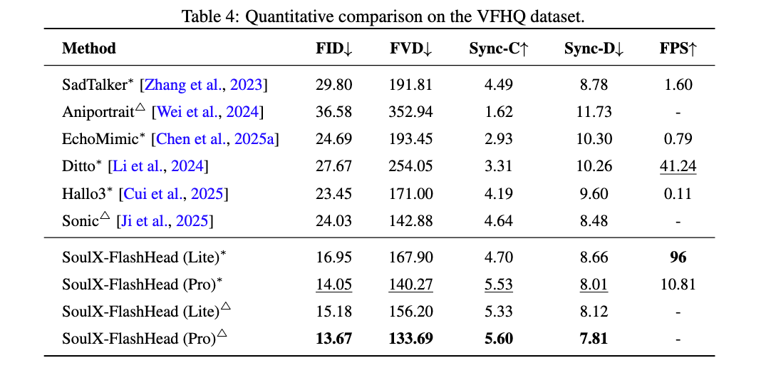 在 HDTF 與 VFHQ 兩大權威數據集的實測中,SoulX-FlashHead 展現了出色的表現: