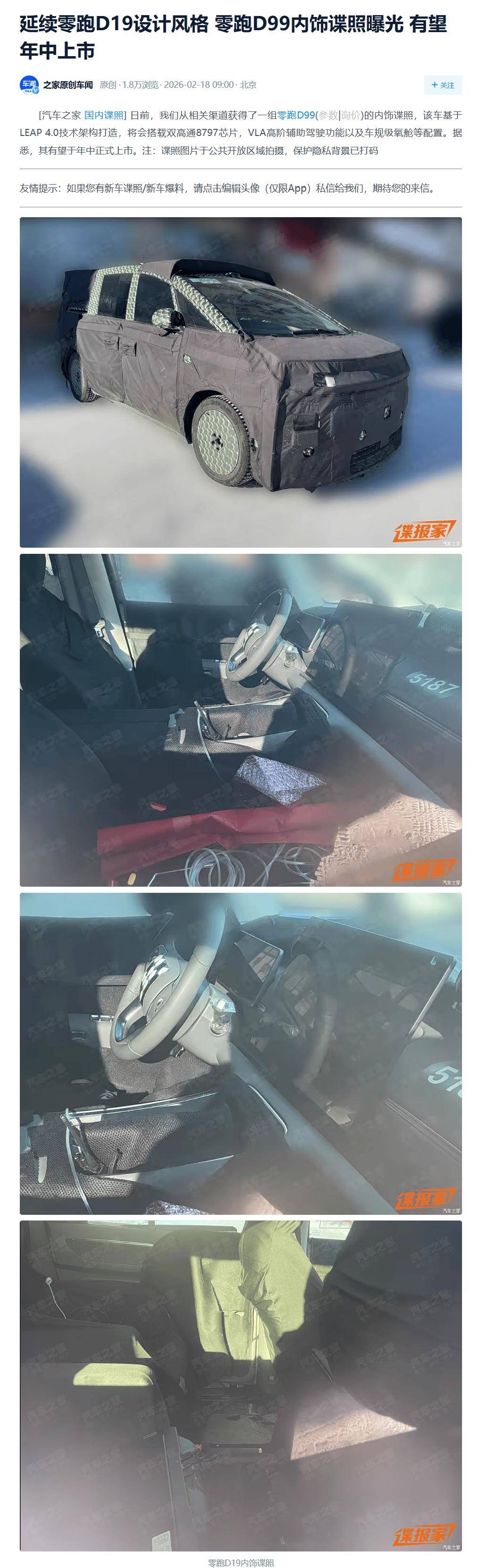 內飾方面,D99延續了零跑D19的設計風格,前排配有懸浮式中控屏、液晶儀表、懷擋、三輻式方向盤和電子門把手,后排預計將配備零重力座椅,提供極致的舒適體驗。座艙內還搭載了行業首創的車規級氧艙、半苯胺頭層真皮座椅、艙駕一體中央域控以及1280TOPS雙8797芯片,配合VLA大模型輔助駕駛和端側大模型智能座艙,為用戶帶來前所未有的智能交互體驗。