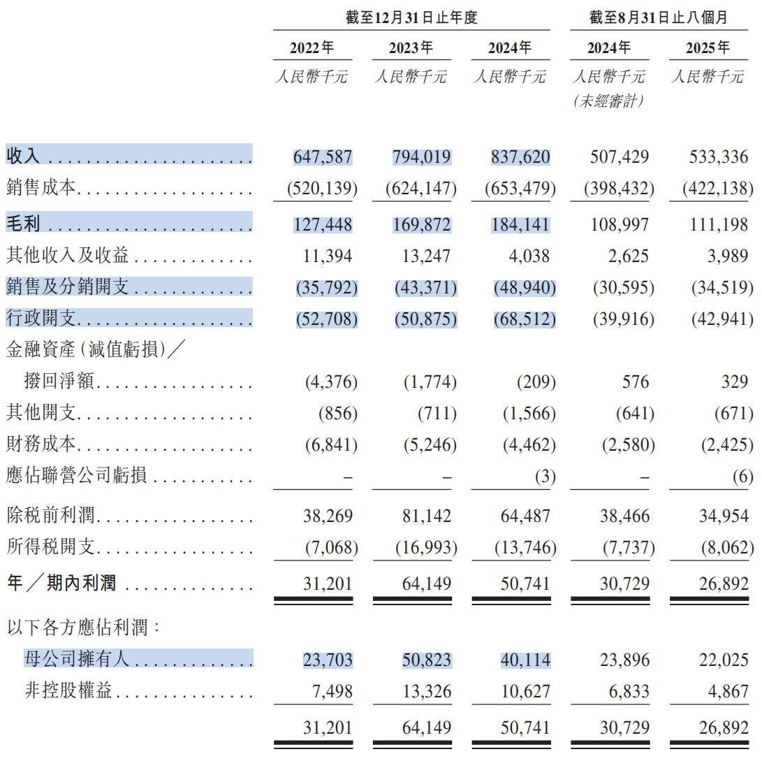 財務數據顯示,優樂賽近三年營收保持增長態勢。2022年至2024年,公司分別實現營業收入6.48億元、7.94億元和8.38億元,復合增長率達14.1%;同期歸母凈利潤分別為0.24億元、0.51億元和0.40億元。2025年前8個月,公司營收進一步增至5.33億元,凈利潤為0.22億元。毛利率方面,公司從2022年的19.7%提升至2024年的22.0%,盈利能力穩步增強。