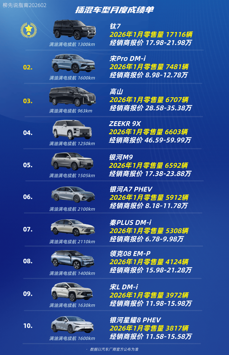 在2026年的插混車(chē)型銷(xiāo)量榜單中,方程豹鈦7、比亞迪宋Pro DM-i和魏牌高山位列前三,月銷(xiāo)量分別為17116輛、7481輛和6707輛。其中,方程豹鈦7上市僅4個(gè)月便登頂銷(xiāo)量冠軍,成為市場(chǎng)焦點(diǎn)。這款車(chē)采用硬派方盒子造型,區(qū)別于傳統(tǒng)家用SUV的設(shè)計(jì)風(fēng)格,顏值出眾且辨識(shí)度高。其搭載的新一代DM技術(shù)支持兩驅(qū)和四驅(qū)模式自由切換,滿油滿電綜合續(xù)航超過(guò)1300公里,滿足了消費(fèi)者對(duì)長(zhǎng)續(xù)航和多功能的需求。極氪9X、銀河M9、銀河A7 PHEV、宋PLUS DM-i等車(chē)型也躋身銷(xiāo)量前十,展現(xiàn)了市場(chǎng)的多元化競(jìng)爭(zhēng)格局。