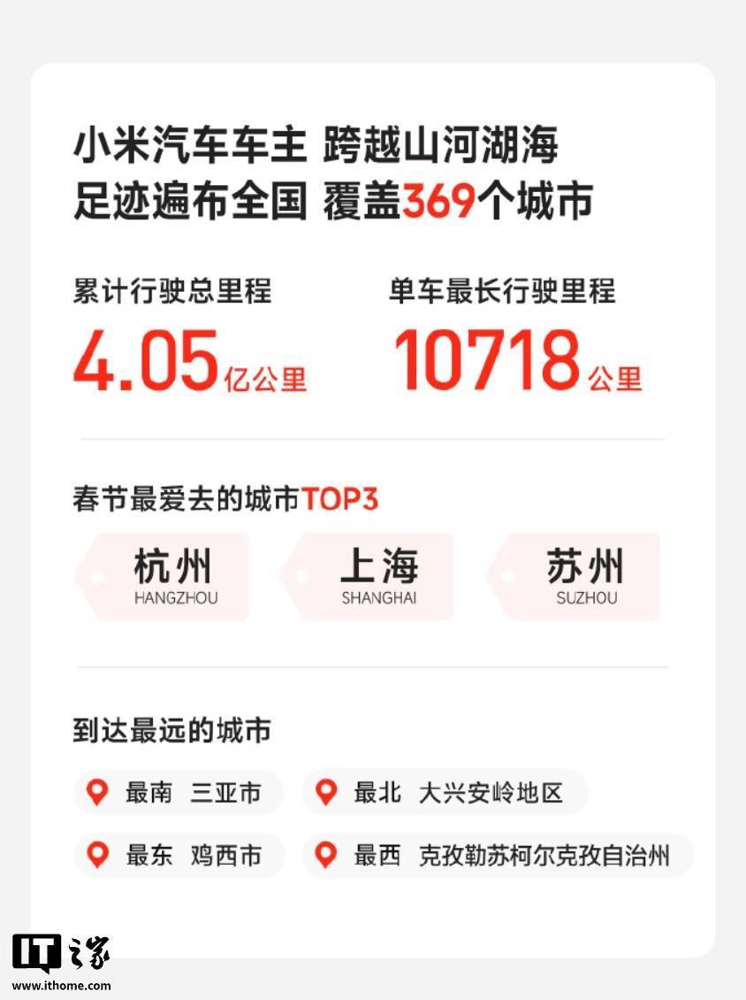 小米汽車近日發(fā)布2026年春節(jié)假期出行數(shù)據(jù)報告,數(shù)據(jù)顯示,全國369個城市的道路上都留下了小米汽車車主的足跡。其中,杭州、上海、蘇州成為春節(jié)期間最受車主青睞的出行目的地,而三亞、雞西、大興安嶺、克孜勒蘇柯爾克孜自治州則分別占據(jù)東南西北四個方向的最遠到達城市。