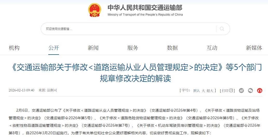 此次修訂后的《道路運輸從業人員管理規定》將于2026年3月20日起正式施行。交通運輸部表示,將根據新規定對相關管理文件進行相應調整,并要求各地交通運輸主管部門做好宣傳解讀和實施準備工作,確保新規定平穩有序落地。