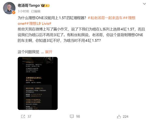 理想汽車產品線負責人“@老湯哥”近日通過社交平臺發文,就理想ONE車型未采用1.5T四缸增程器的技術選擇作出詳細說明。他坦言,這一決策并非主觀意愿,而是受限于2017年增程技術市場的發展現狀。