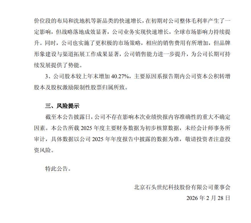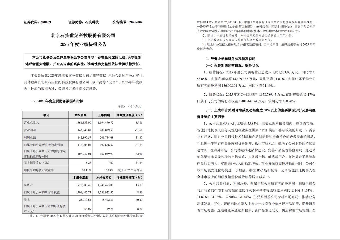 石頭科技2025年營收大增55.85%達186.16億,凈利潤卻下滑31.19%為13.6億
