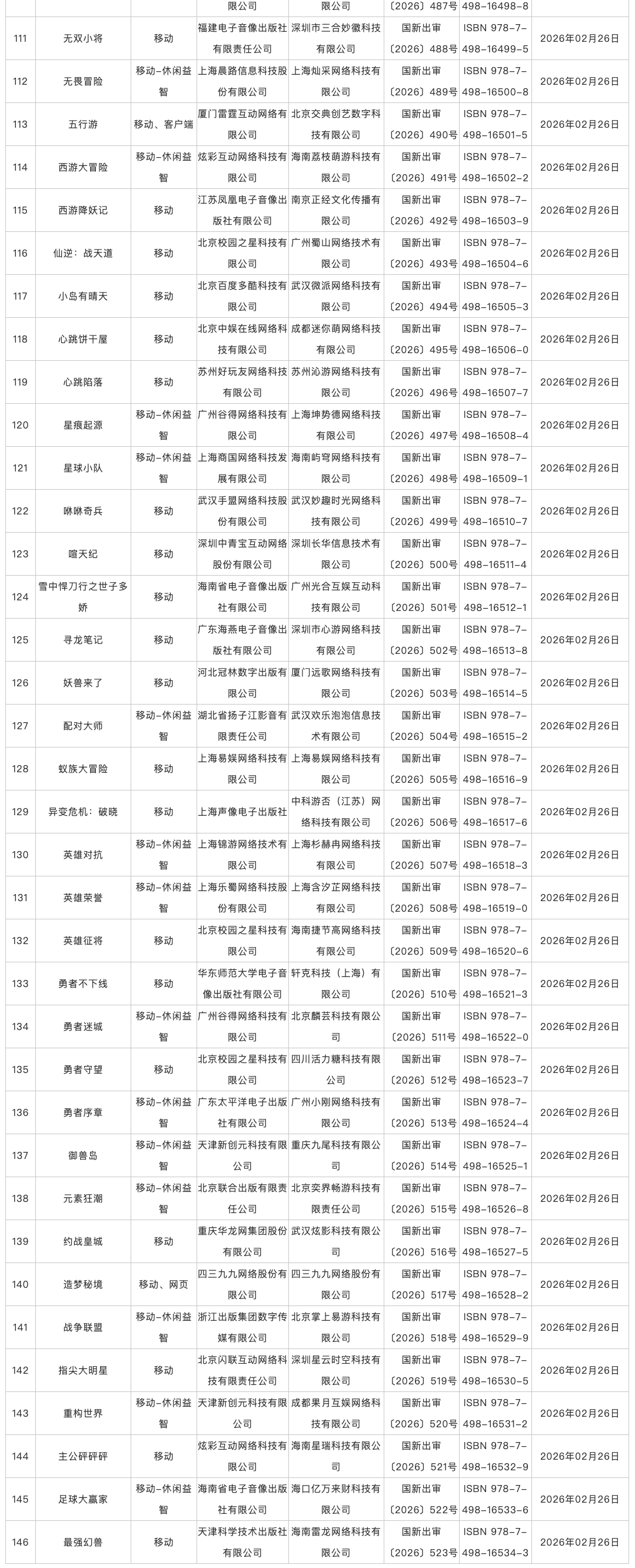 近日,國(guó)家新聞出版署對(duì)外發(fā)布了最新一批國(guó)產(chǎn)網(wǎng)絡(luò)游戲的審批結(jié)果。此次公布的2026年2月份審批信息顯示,共有146款國(guó)產(chǎn)網(wǎng)絡(luò)游戲順利通過(guò)審核,獲得版號(hào)。