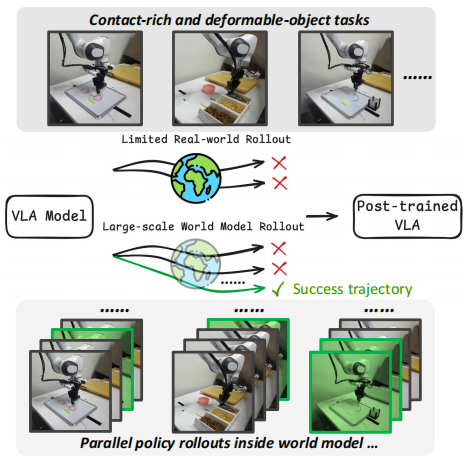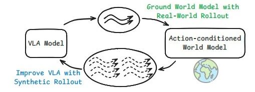 VLA 策略采集的真實交互數據,反過來用于提升世界模型的物理保真度;