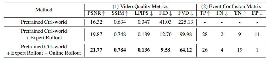 1. 經過真實試錯數據微調后的世界模型,在 PSNR、SSIM 等視頻質量指標上,全面超過了原始預訓練模型,以及僅用專家成功數據微調的模型,生成的視頻畫面更貼合真實;