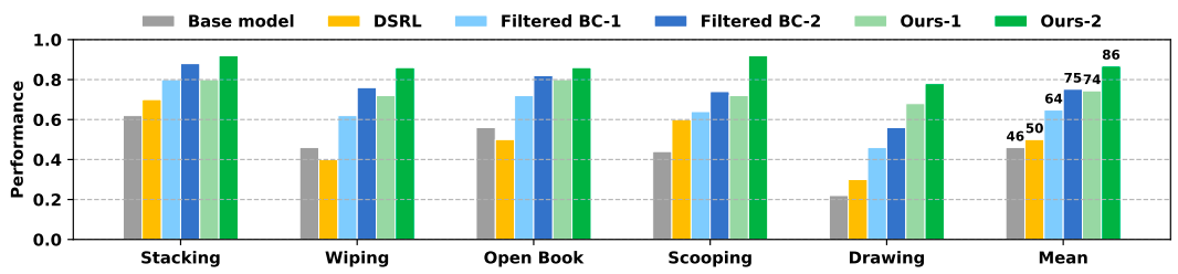 與基線方法的成功率提升對比。進行了兩輪迭代訓練,「Ours-1」表示 VLAW 方法經過第一輪在線 rollout 后的結果。總體而言,在多任務設置下 VLAW 持續優于 Filtered BC 和 DSRL 基線