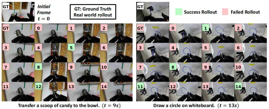 GT 代表真實世界的 rollout,0~14 代表世界模型生成的多種想象軌跡,所有軌跡均從相同的 GT 初始幀出發并使用 π0.5 策略。在真實世界 rollout 中,機器人未能抓住勺子(左,GT)且未能畫出完整的圓(右,GT)。借助世界模型,我們能為這些失敗案例找到成功的軌跡,這對策略學習具有重要意義