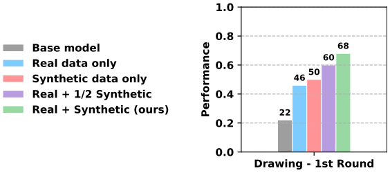 消融實驗研究了 (1) 用于策略微調的合成數據量(從 500 條減少到 250 條)和 (2) 微調時是否包含真實世界 rollout 數據(50 條)。實驗發現,減少合成軌跡數量或移除真實世界數據集都會導致性能下降