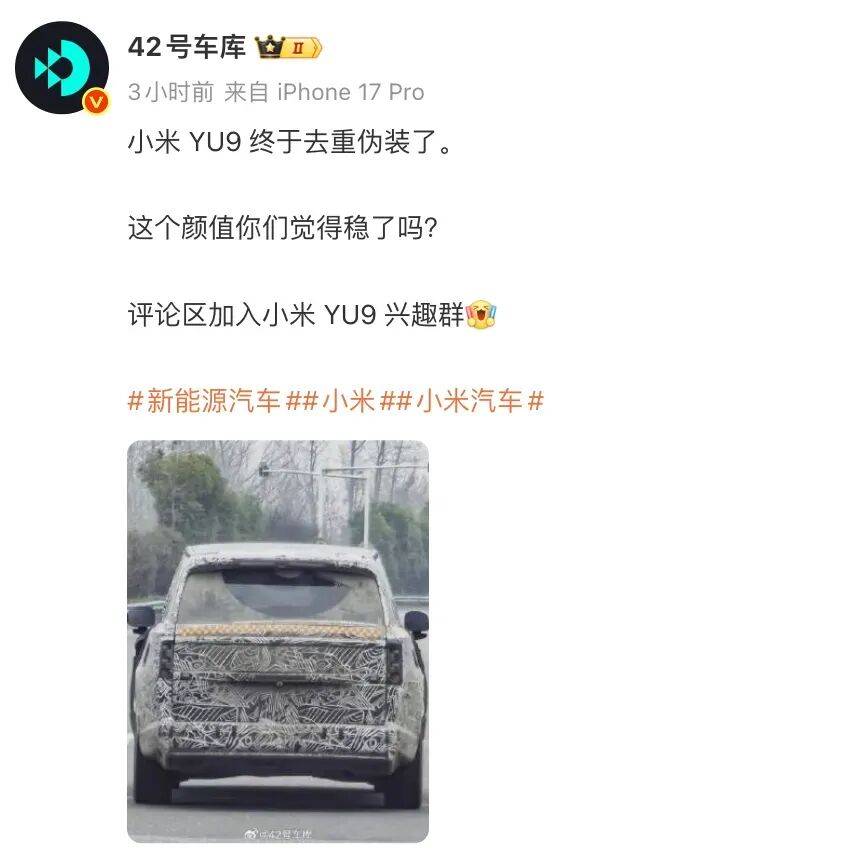 除了SU7,小米汽車另一款新車型也引發關注。博主@42號車庫曝光了小米YU9的輕偽裝實車照片。據透露,該車型內部代號為“昆侖”,定位為30-50萬元級的大六座/七座增程SUV,預計將進一步豐富小米汽車的產品線。