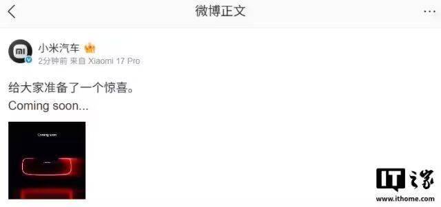 小米汽車即將帶來新動作!今日,小米汽車官方發布預告:“給大家準備了一個驚喜。Coming soon...”,隨后雷軍轉發該消息并配文“明天見”,引發外界對小米汽車新動態的強烈關注。