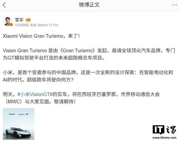 小米創辦人、董事長兼CEO雷軍近日在社交平臺公布了Xiaomi Vision Gran Turismo雙門超跑的官方設計圖,多角度展示了這款未來感十足的概念車型。作為小米首款參與國際頂級汽車設計項目的作品,該車型將于西班牙巴塞羅那世界移動通信大會(MWC)首次亮相實車。