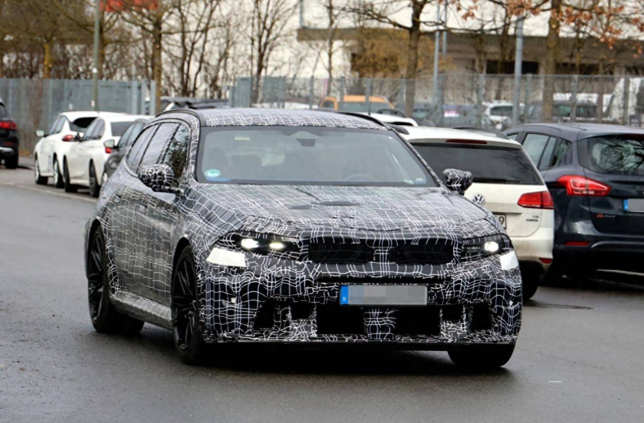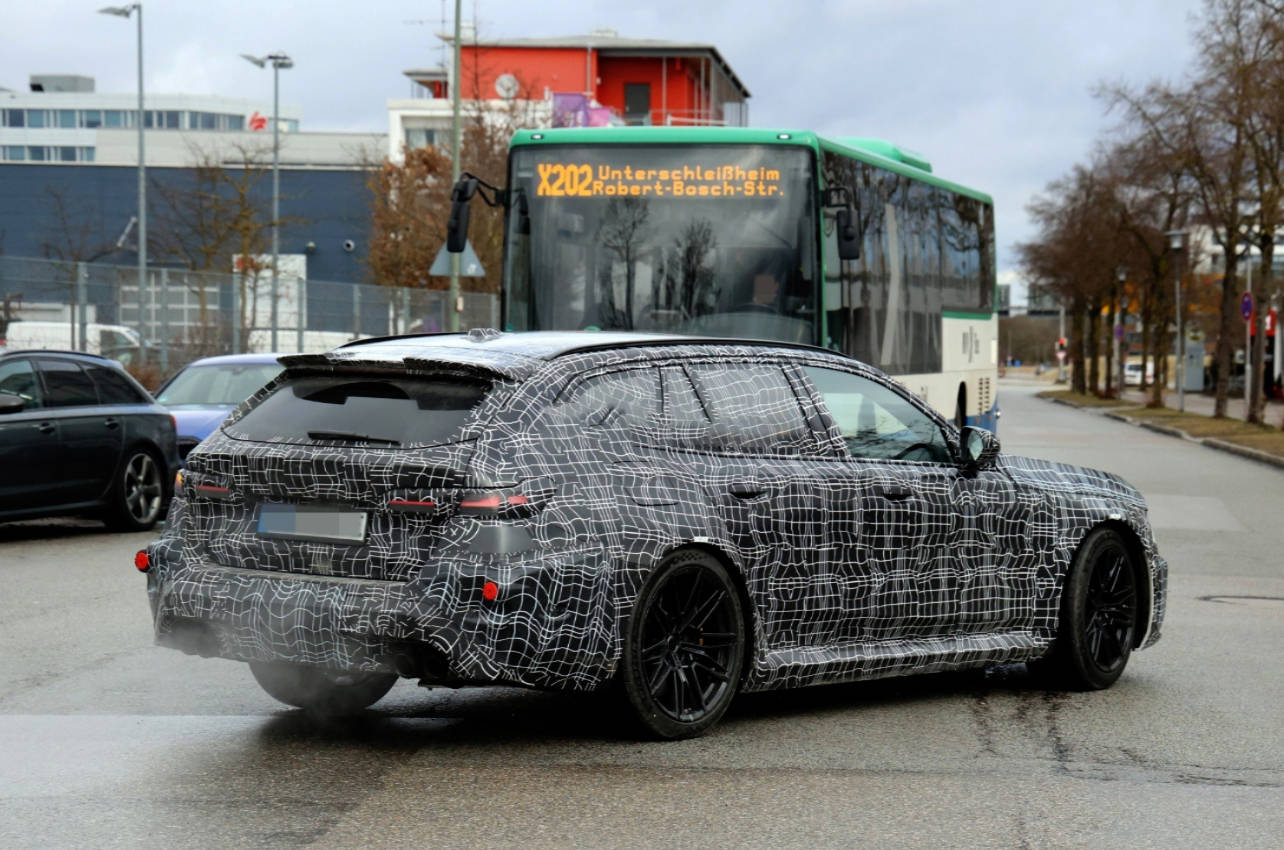 外觀層面,新車延續了寶馬性能車型的凌厲氣質。前臉設計借鑒了新一代iX3與i3的標志性元素,狹長的LED燈組與雙腎格柵形成銳利的視覺沖擊,下方進氣口采用三段式布局,強化了空氣動力學性能。車身側面保留了旅行車標志性的修長輪廓,但通過更突出的輪拱與低扁平比輪胎,營造出蓄勢待發的戰斗姿態。車尾部分雖被偽裝覆蓋,但雙邊共四出的排氣布局與擴散器設計,暗示著其強大的動力儲備。