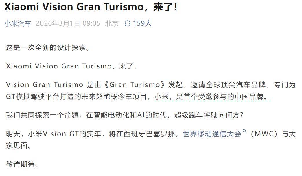 小米汽車官宣入局超跑領域 攜Vision GT實車亮相MWC探索未來出行