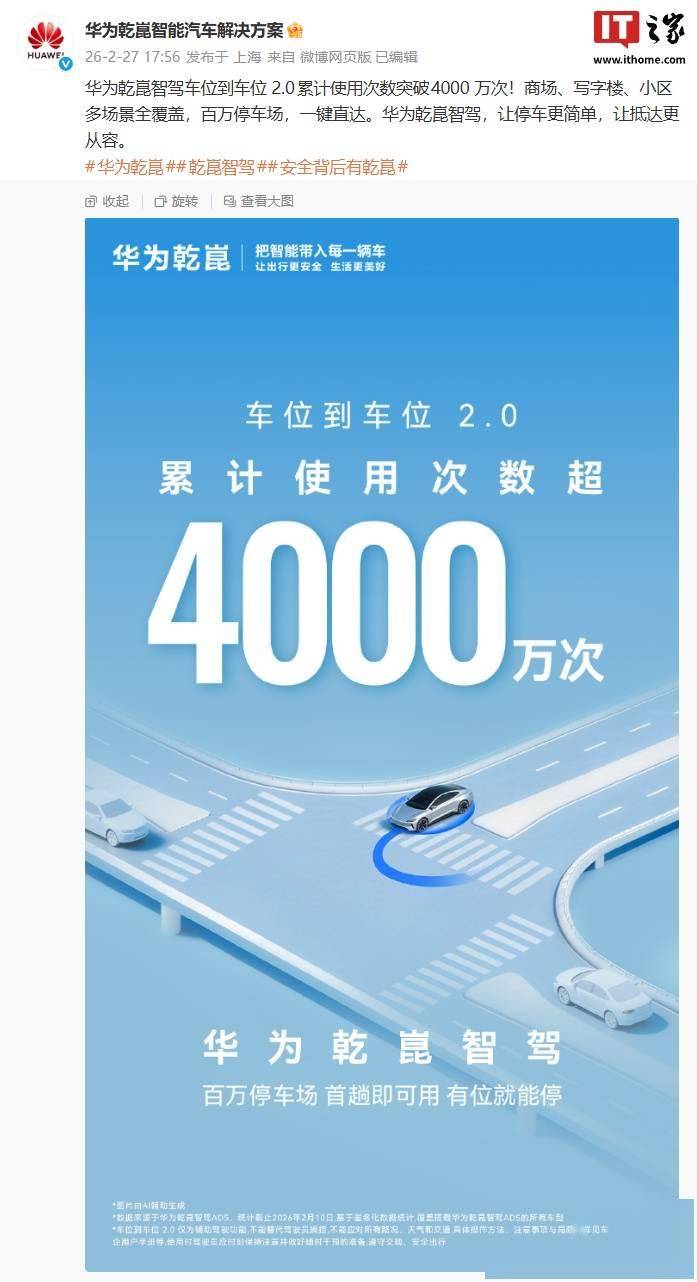 華為乾崑智能汽車解決方案官方微博近日披露,其自主研發的乾崑智駕車位到車位2.0功能累計使用量已突破4000萬次。該功能通過多場景適配能力,在商場、寫字樓、住宅小區等復雜停車環境中實現全覆蓋,目前已與全國超百萬個停車場完成數據對接。