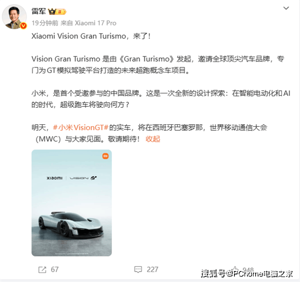 小米雷軍官宣:Vision Gran Turismo實車將亮相MWC 開啟超級跑車新探索