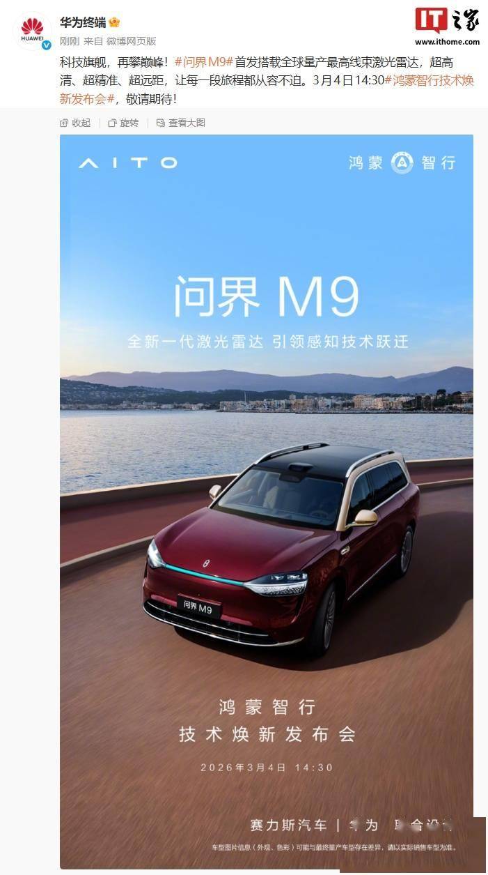 鴻蒙智行技術(shù)煥新發(fā)布會(huì)已確定于3月4日14:30舉行,官方以"萬象更新,馭見未來"為主題,暗示將發(fā)布多項(xiàng)技術(shù)突破。從預(yù)熱節(jié)奏判斷,發(fā)布會(huì)將重點(diǎn)圍繞智能駕駛領(lǐng)域展開,問界M9與尊界S800作為技術(shù)載體,預(yù)計(jì)將展示華為在自動(dòng)駕駛感知層面的最新成果。值得關(guān)注的是,這兩款車型分別定位高端SUV和豪華轎車市場(chǎng),技術(shù)下放策略或?qū)⒅厮苄袠I(yè)競(jìng)爭(zhēng)格局。