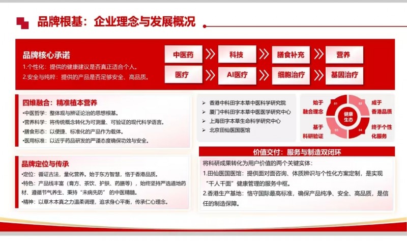 田仙醫秉持“個性化、安全純粹”理念,深耕大健康領域,構建“中醫藥+科技”雙軌發展路徑,融合中醫哲學、營養科學、膳食形態與醫用標準,打造精準植本營養體系。依托香港、廈門、上海、北京多地科研與服務平臺,以道地藥材、節氣養生為特色,遵循“未病先防”理念,提供膏方、茶飲、護膚、藥膳等多元產品。品牌以科研為支撐、香港品質為保障,通過個性化健康方案,實現傳統中醫藥與現代生命科學深度融合,為大眾提供專業、安全、高效的健康服務。