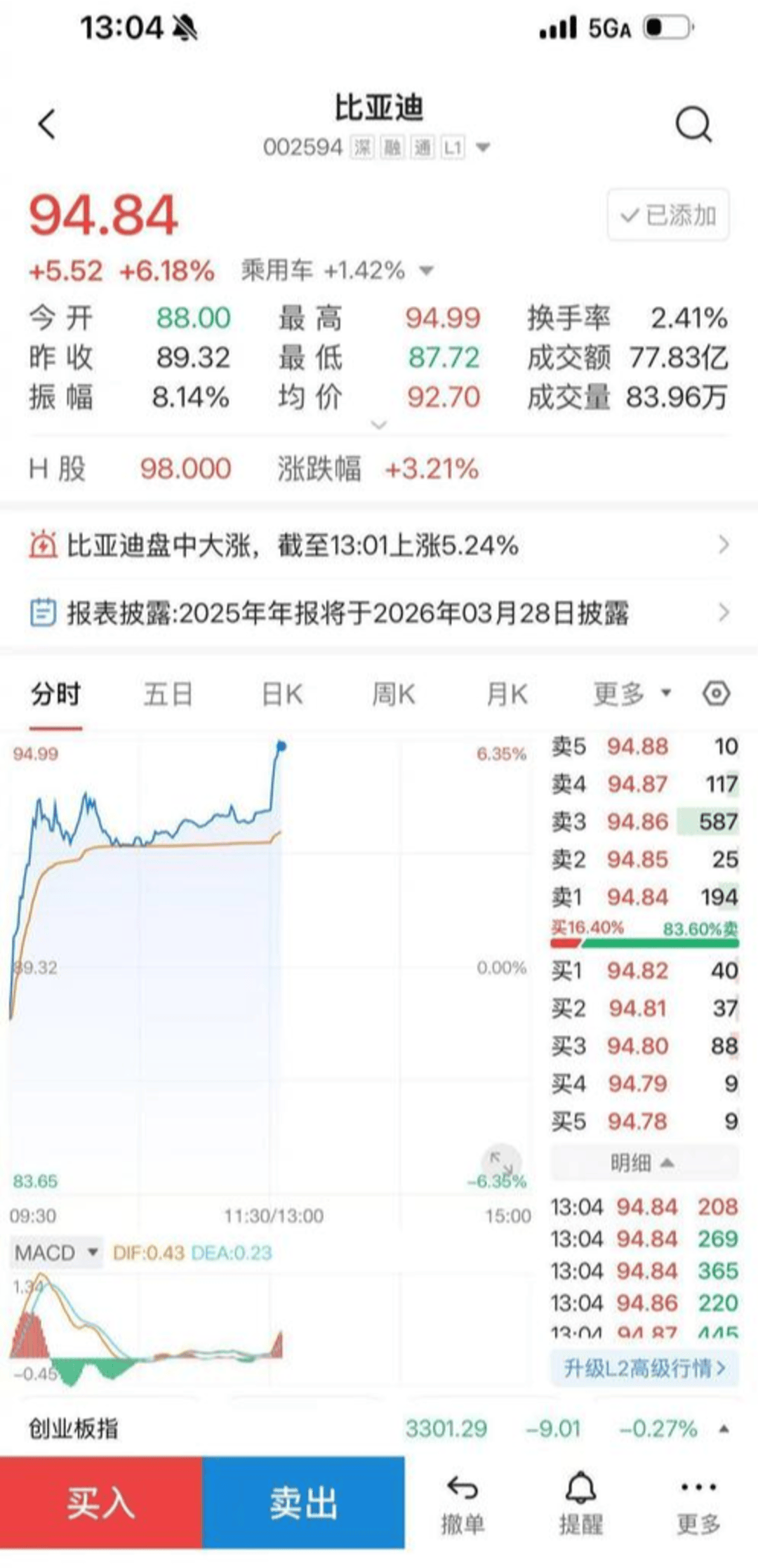 受此消息影響,比亞迪A股股價在發布會官宣當日大幅上漲,收盤漲幅達8.36%,單日成交額突破135億元,成為汽車板塊的領漲標的。市場分析認為,這一技術預期不僅提振了投資者信心,也進一步鞏固了比亞迪在電池和整車領域的核心競爭力。
