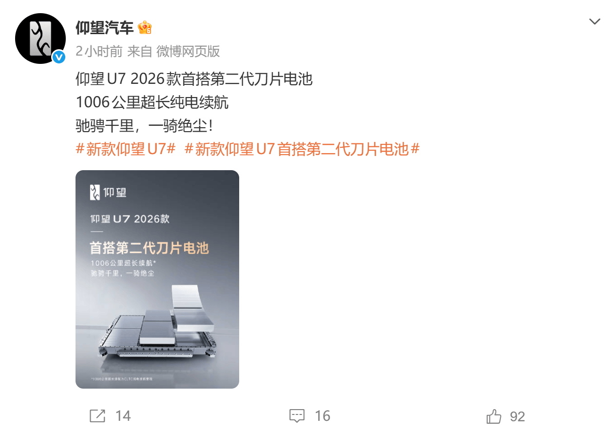 比亞迪宣布,其第二代刀片電池將首次搭載于2026款仰望U7大型純電轎車上。這款新車憑借兩項(xiàng)關(guān)鍵技術(shù)指標(biāo)引發(fā)行業(yè)關(guān)注:純電續(xù)航里程突破1006公里,電池包容量達(dá)150kWh。若第三方實(shí)測數(shù)據(jù)與官方宣稱一致,該車型將顯著緩解消費(fèi)者對電動(dòng)汽車的續(xù)航與充電焦慮。