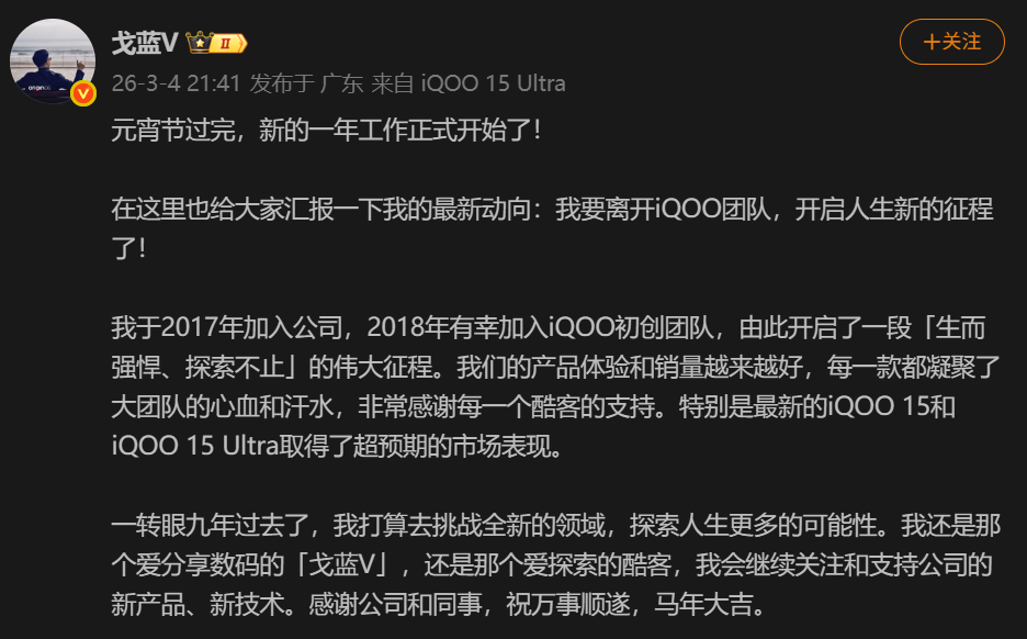 iQOO產品經理簡重(微博賬號@戈藍 V)通過個人社交平臺正式宣布,已結束其在iQOO團隊的任職生涯,即將開啟事業新篇章。這位在數碼領域深耕多年的行業人士,在元宵節后首個工作日向公眾披露了這一重要決定。