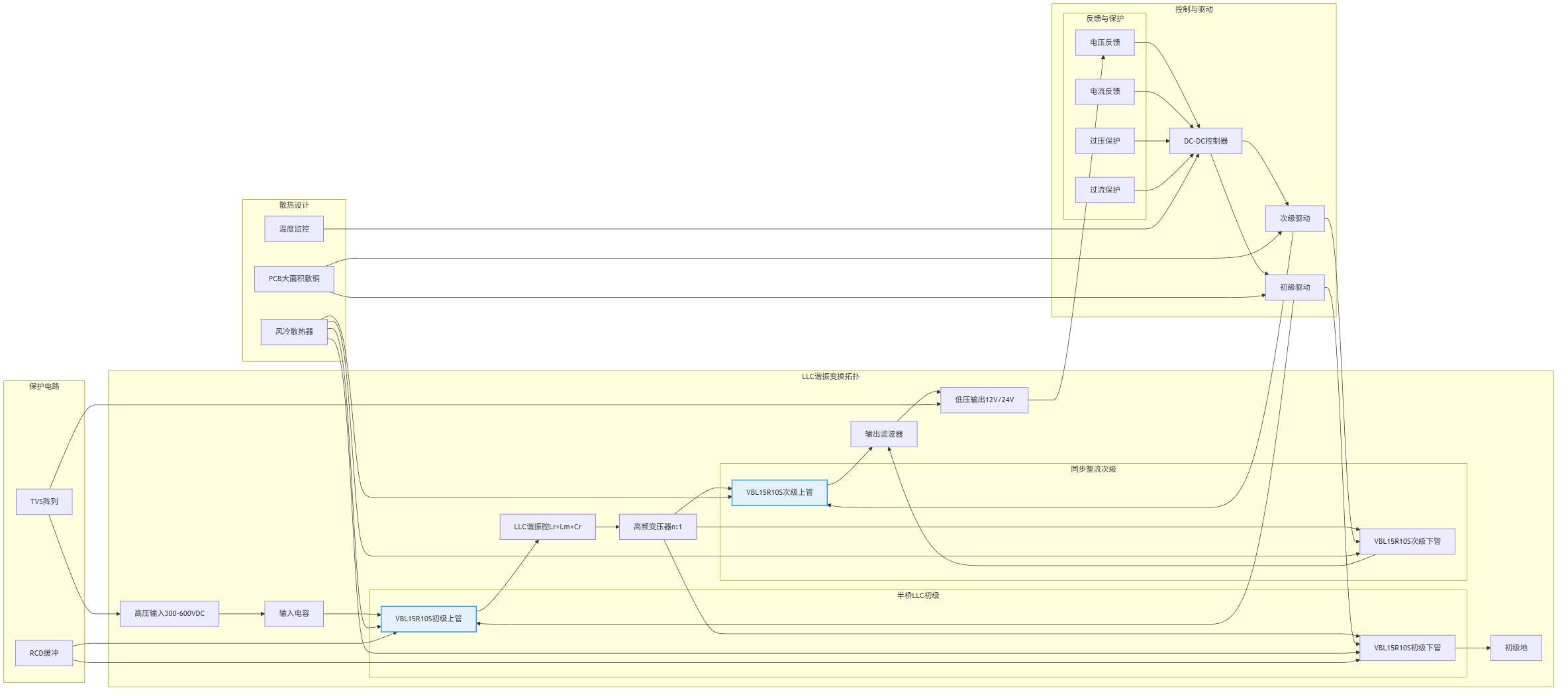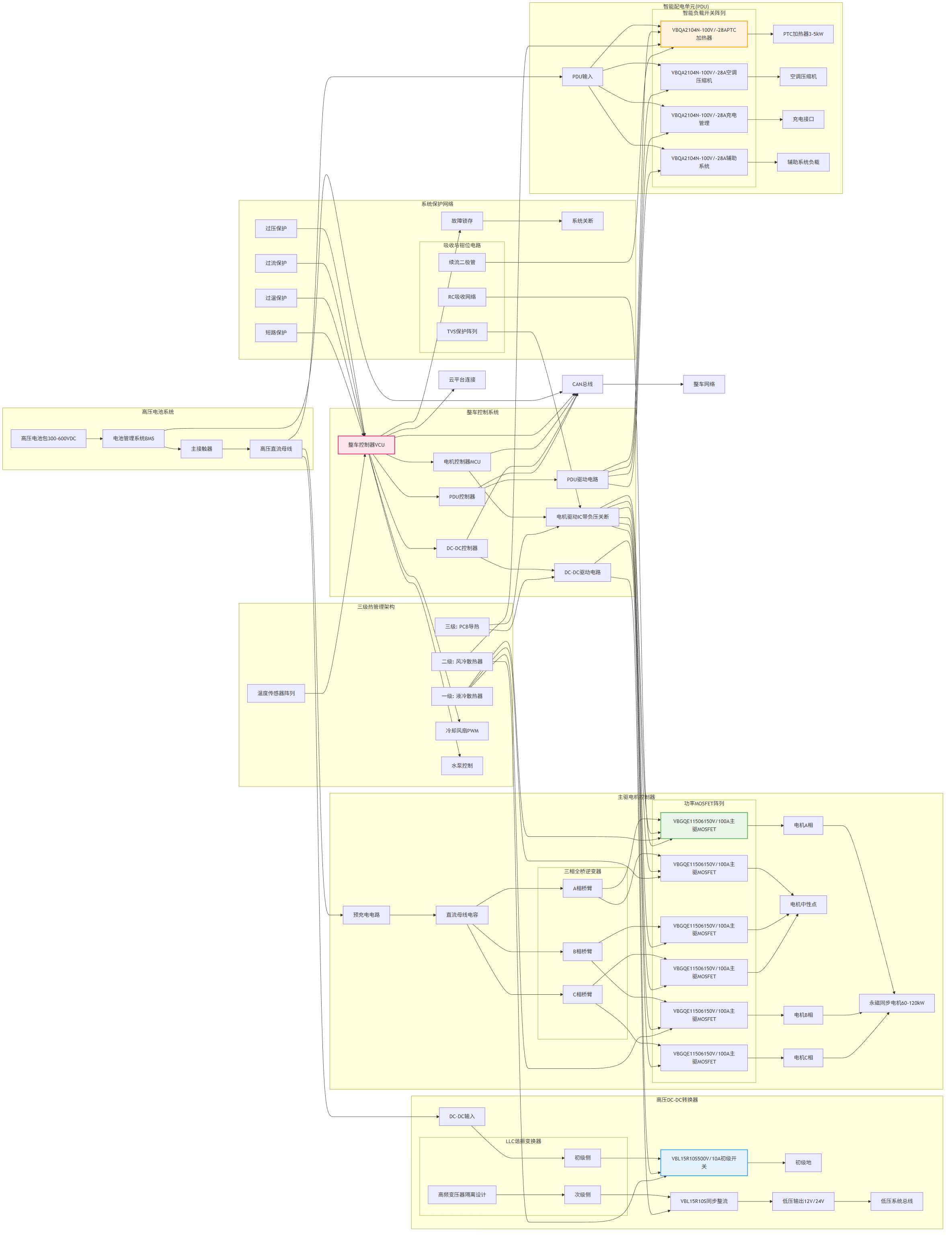 系統設計需重點關注驅動與保護電路、熱管理及電磁兼容性。主驅MOSFET需采用帶負壓關斷與米勒鉗位功能的專用驅動IC,確保開關可靠性;DC-DC與配電MOSFET的驅動回路應縮短寄生電感,并通過柵極串聯電阻優化開關軌跡。熱管理采用分級策略,主驅器件使用水冷散熱器,其他器件根據功率等級選擇風冷或PCB導熱方案;關鍵點位布置溫度傳感器,實現動態熱管理。電磁兼容性方面,需在漏-源極并聯RC吸收網絡或TVS,功率回路采用低寄生電感設計,并添加ESD保護器件;系統級集成過壓、過流、過溫及短路保護,符合ISO 26262功能安全標準。