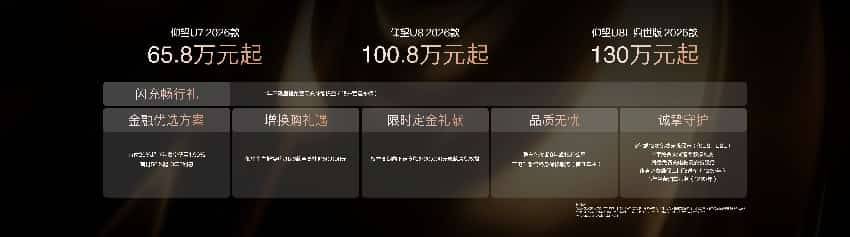 三款新車定價延續仰望品牌的高端定位:U7 2026款起售價65.8萬元,U8 2026款起售價100.8萬元,而定位行政旗艦的U8L鼎世版起售價達130萬元。盡管價格不菲,但閃充技術帶來的補能效率提升被視為解決用戶痛點的關鍵——長途旅行或商務出行時,充電時間可縮短至一杯咖啡的功夫,仰望將其定義為“對時間的絕對掌控”。